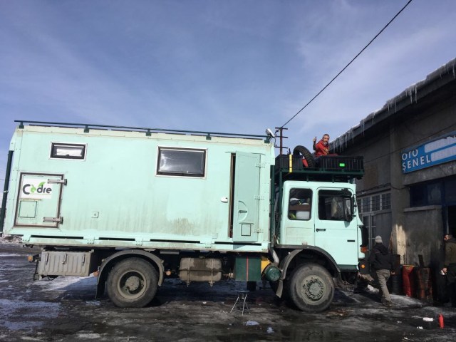 Il tient bon jusqu’à Ardahan où nous arrivons sous quelques flocons, et nous mettons à la recherche, d’un mécano qui arrivera (ou plutôt arriveront), un peu tard pour pouvoir lancer quoi que ce soit.