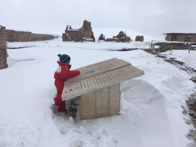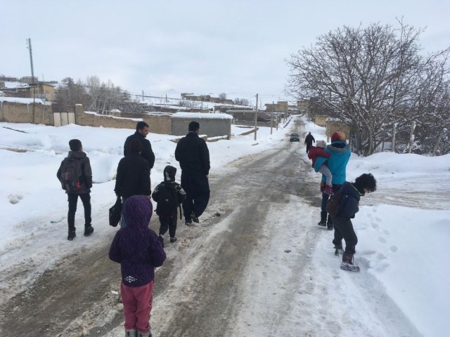 Au petit matin, pas d’appel du Muezzine, beaucoup moins présent ici qu’en Turquie (tout comme les mosquées, moins visibles), mais on sera bien à l’heure pour le petit déjeuner. Les enfants sont tout excités à l’idée “d’aller à l’école” et de se présenter à une classe de petits iraniens. Nous accompagnons donc toute la famille dans les rues verglacées de Joplo après un bon petit déjeuner. Malheureusement, nos espoirs seront vite refroidis par le directeur de l’école qui nous éconduit assez sèchement. Grosse déception pour les enfants et nous, et bien sûr pour Khalid et sa famille qui voulaient nous faire plaisir. Eh bien tant pis, ce sera pour une autre fois Inchallah, et ça n’enlève rien bien sûr à l’accueil exceptionnel que nous avons recu. Nous quittons nos hôtes pour reprendre la route, en laissant en souvenir quelques-unes des photos imprimées.