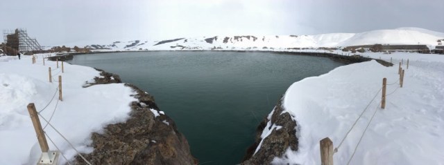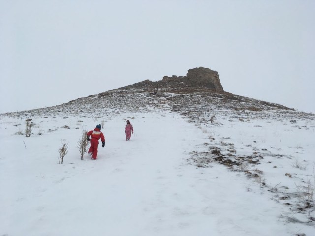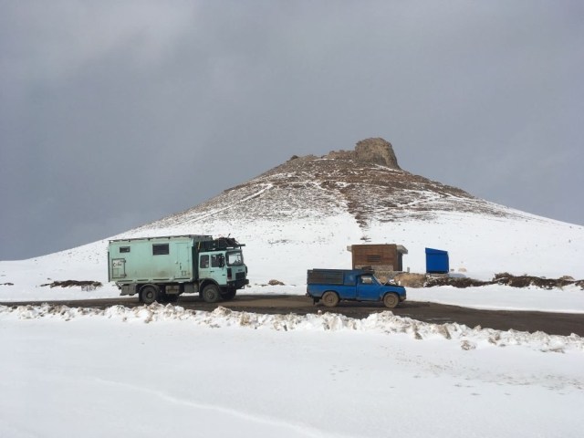 Quelques kilomètres avant Takab, première étape au cratère bien enneigé et assez hallucinant du Zendan-e Soleimane. Nous en ferons l’ascension à tour de rôle, pour apprécier la vue plongeante sur le gouffre de près 100 m de profondeur. Faux pas interdit!
