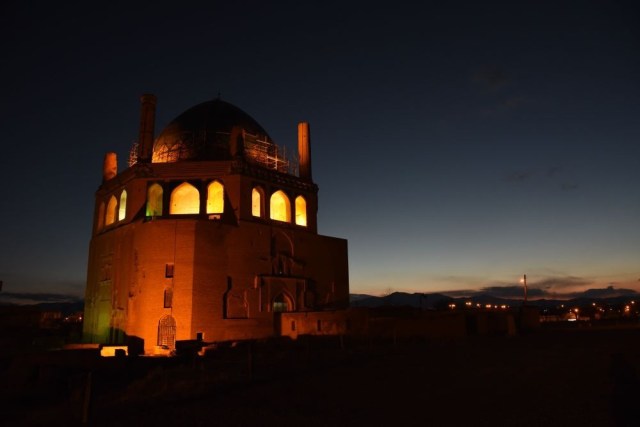 Après une nuit dans un champ, nous passerons par Zanjan, dernière grande ville avant Qazvin où nous prévoyons de passer la nuit. Ah, un site à voir sur le chemin : le mausolée du sultan Oljeitu à Soltaniyeh qu’on distingue à 7 km de la voie rapide. Chanceux : nous y arrivons juste au soleil couchant qui illumine les murs de briques et l’immense coupole turquoise, et, derniers visiteurs de la journée, nous pourrons admirer la pleine lune depuis l’étage supérieur de ce très beau bâtiment (en partie en restauration).