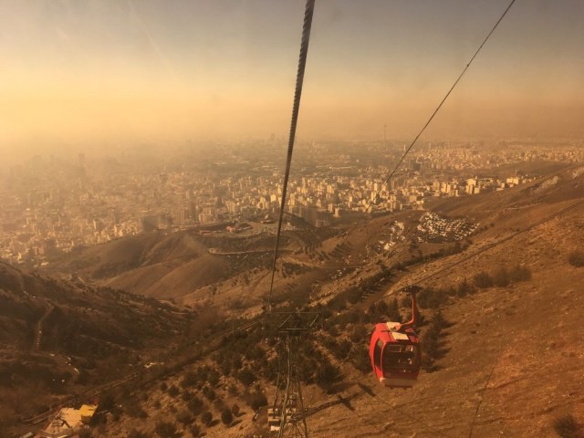 Nous prenons le risque (limité) de rouler sur les multiples highways puis sur les axes plus centraux de Téhéran avant l’heure officielle de circulation des camions, et ça passe sans problème. Direction les quartiers Nord de la capitale, et le parking à proximité du télécabine qui mène à la station de Tochal, entre 2500 m et 4000 m d’altitude. Repérages et prise d’informations pour être prêts le lendemain : entre les navettes, la location du matériel, les 45 min de téléphérique et la fermeture de la station à 15h, il va falloir se lever tôt!