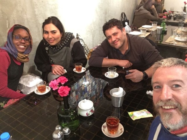 Revenus plus près du centre après la journée sur les pistes, nous parvenons à nous garer au même endroit tranquille que lors de notre séjour précédent. Journée touristique en attendant le rendez-vous avec Ruhollah, artiste et spécialiste en calligraphie persane en contact avec Loïc, et qui a la gentillesse de contribuer à notre projet d’habillage de la carrosserie d’Arty!