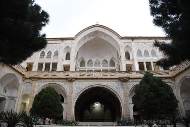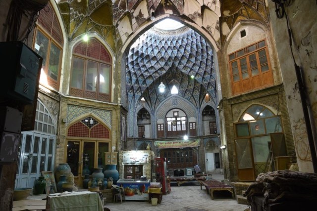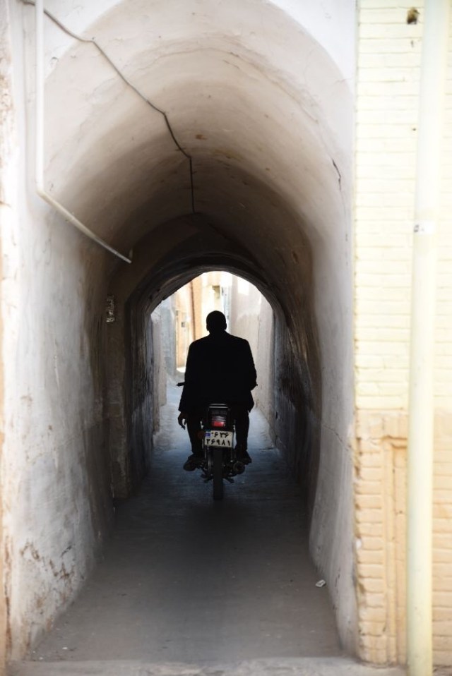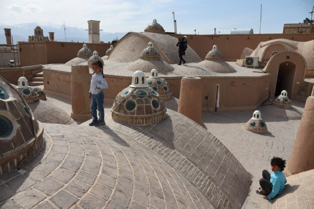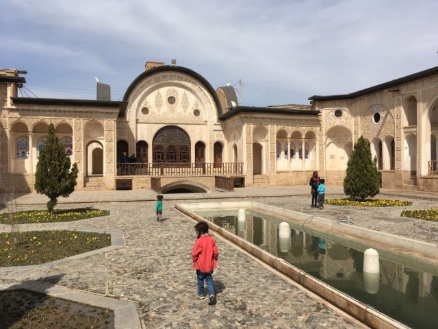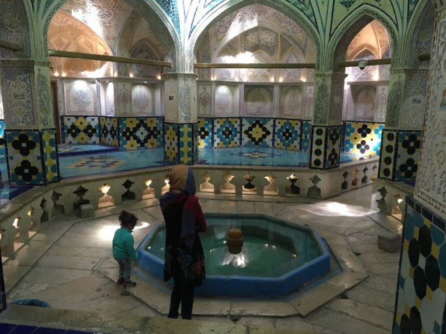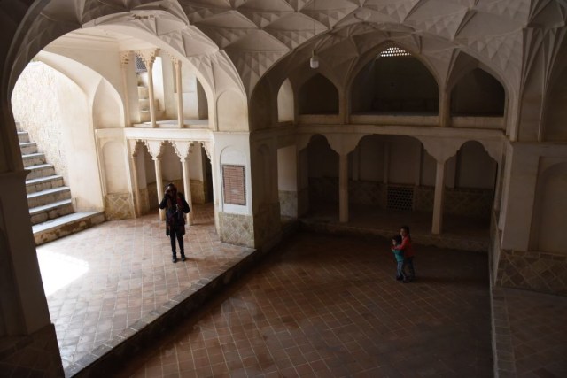 Nous prendrons le pass qui permet l’accès à trois sites, et commencerons par la Kahn-e Tabatabaei : derrière une entrée presque quelconque, c’est un dédale d’ouvertures, de couloirs, de recoins, de dômes finement décorés, de magnifiques patios avec leurs bassins, ingénieusement construits sur plusieurs niveaux, avec les fameux badgirs (tours à vent), climatisations naturelles parfaites pour les chaleurs torrides du désert. Et en parallèle une orientation permettant à certaines parties du bâtiment de profiter au maximum de l’ensoleillement en hiver.