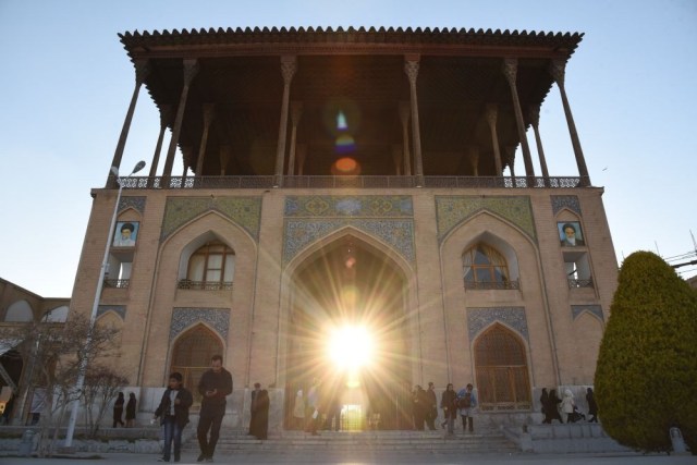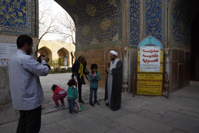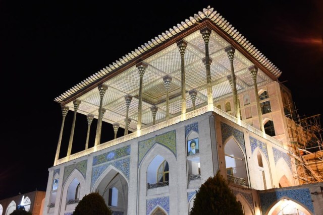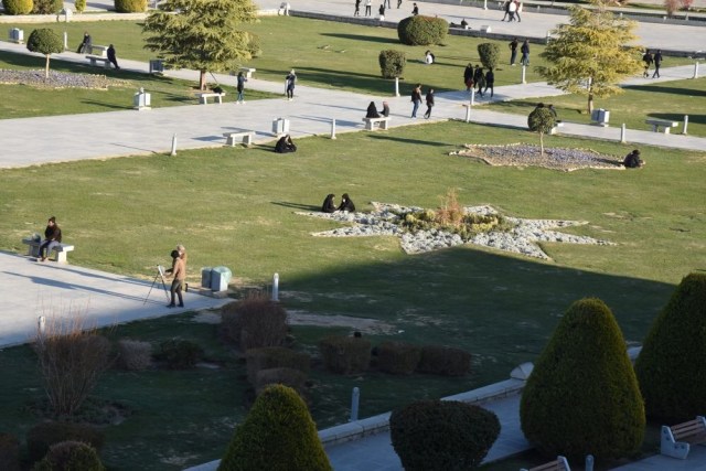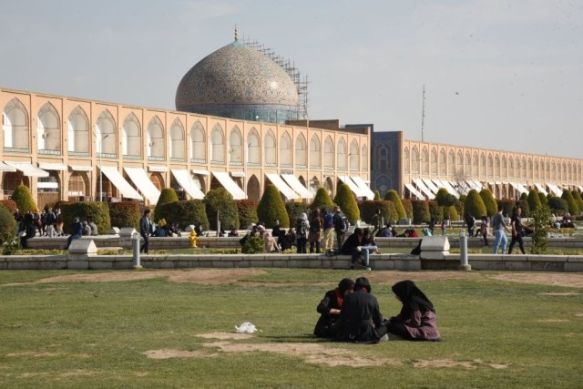 C’est qu’elle ne manque pas d’attraits, entre ses pelouses fleuries, ses allées impeccables, son immense bassin (il faudra quand même attendre un peu pour les jets d’eau), et quantité de sites magnifiques, de jour comme de nuit, édifiés pour beaucoup sous le règne du Shah Abbas Ier : mosquée Masjed-e Shah (vue), mosquée Masjed-e Lotfollah (pas vue), palais Ali Qapu et son impressionnante terrasses aux dix-huit colonnes sculptées (vu), Bazar e-Lahvafa (vu), galeries pleines de magasins de pièces (plus ou moins) artisanales (faïence, tapis, tapisseries,…). Le tout, sans l’afflux de touristes attendus 10 jours plus tard pour Norouz, et avec des marchands plutôt sympathiques et pas trop insistants (comme souvent en Iran).