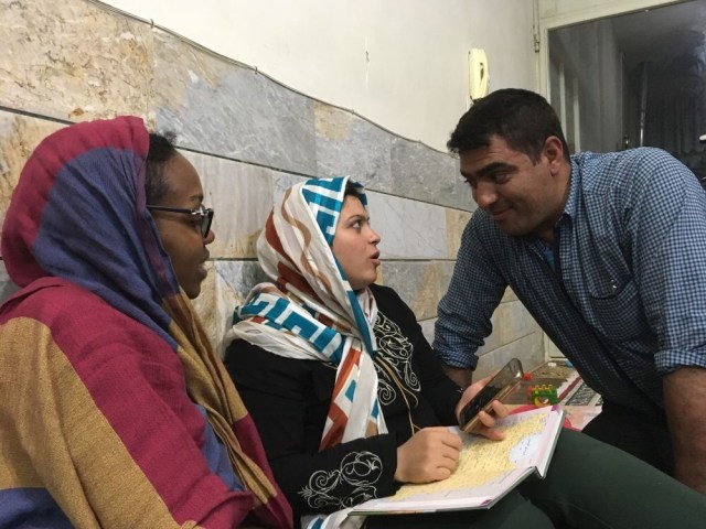 Alors que nous aprêtons à partir, Mustaba, qui nous a bien aidés, nous invite pour le dîner. Cette hospitalité et ce plaisir de recevoir des étrangers, avec juste quelques mots d’anglais, c’en est presque fou! Pas de ta-root pour nous, (tradition iranienne qui consiste à refuser trois fois un cadeau ou une invitation avant d’accepter), nous passerons donc la soirée à Nehzat Abad, en compagnie des 3 générations de la sympathique famille, qui nous propose aussi de rester pour la nuit.