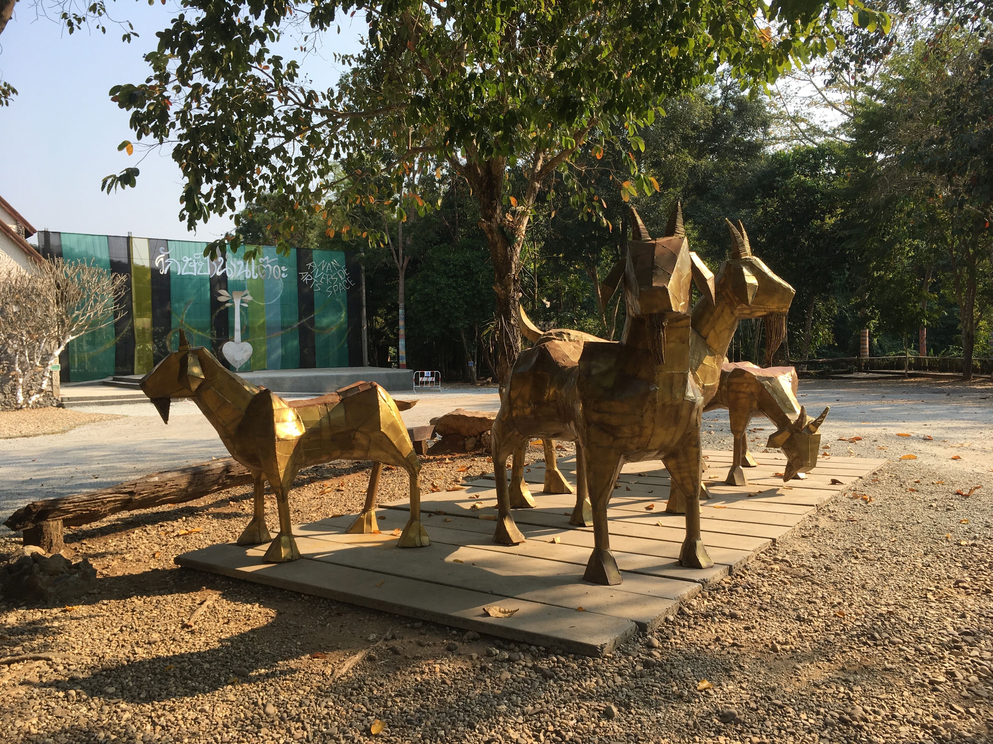 Cap sur les hauteurs de la ville et le Parc National de Doi Suthep-Pui, poussant le plus loin possible sur cette route de montagne. Mais la chaussée devient trop étroite pour notre gabarit, demi-tour obligatoire. On doit aussi renoncer à finalement passer la nuit dans le coin, la route de montagne ne laissant que peu de possibilités d’arrêts, et le seul camping que nous trouvons, bien que charmant, est trop cher! Bon, un grand tour pour rien donc, il est trop tard pour visiter les sites qui ont fermé, on redescend vers la ville, prenant au passage deux auto-stoppeuses finlandaises, pour finalement atterrir sur le Campus universitaire où les gardes auront la gentillessse de nous laisser nous garer sur un petit parking ombragé un peu à l’écart.