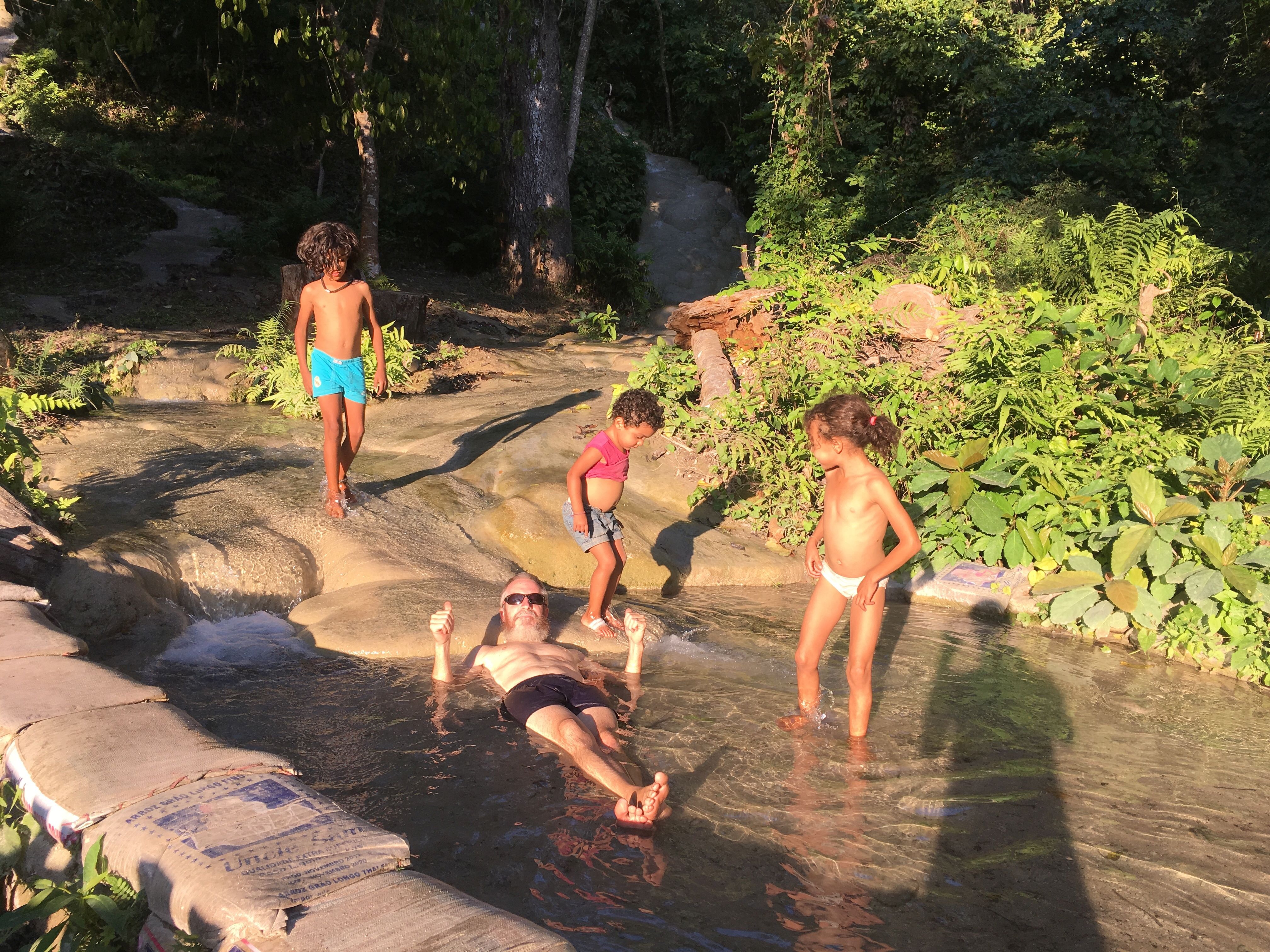 Pas la peine de trop se presser, on prend le temps d’un petit tour à l’hopital pour une petite réparation de la résine dentaire d’Edrian, avant d’aller nous rafraîchir à la jolie cascade de Bua Tong à 60 km au Nord de la ville, et de passer un très bon moment avec Taras, le motard ukrainien (et un de ses amis) qui avait été notre compagnon de convoi sous escorte dans le Balouchistan pakistanais!