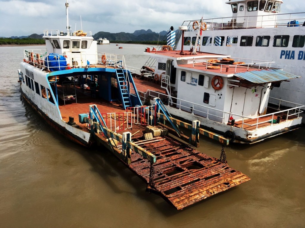 Une petite traversée d’une heure plus tard, à bord d’un ferry plus très jeune sous un ciel certes moins pollué mais toujours bien voilé, nous arrivons à Cat Ba, plus grande île de la baie. Le transfert vers un autre minibus se fera sans problème, témoignant d’une mécanique plutôt bien huilée derrière l’unique et presqu’insignifiant petit ticket en papier qu’on nous a remis la veille : nous serons ainsi déposés juste devant notre hôtel en pneu en retrait du front de mer, le bus continuant sa tournée de distribution de touristes à leur point de chute. Accueil empressé et sympathique du réceptionniste, qui ne tardera pas à tâter le terrain côté activités annexes qui pourraient nous intéresser, à commencer bien sûr par l’activité reine : les croisières au milieu des pitons karstiques de la baie! Tant qu’à être venus jusqu’ici, on s’en offrirait bien une avec au moins une nuit sur l’eau. Mais nos espoirs sont vite douchés : fête du Têt et personnel en congés obligent, pas de croisières sur plus d’une journée…Bon, c’est déjà bien vu les circonstances…Cela dit, pas besoin de se précipiter : la météo n’est pas encore au top, mais une fenêtre d’éclaircies est annoncée deux jours plus tard, ce qui nous laisse aussi le temps de faire jouer la concurrence. Après avoir pris possession de notre grande chambre (ça change d’Hanoï!), puis dégusté un Bun Cha qui nous laissera une nouvelle fois le ventre à moitié vide, on ira se dégourdir les jambes sur le front de mer, balade qui nous mènera surtout près d’énormes complexes hôteliers en cours de travaux ou de construction, avec vue imprenable sur la baie, malheureusement toujours aux teintes mornes sous ce ciel bas.