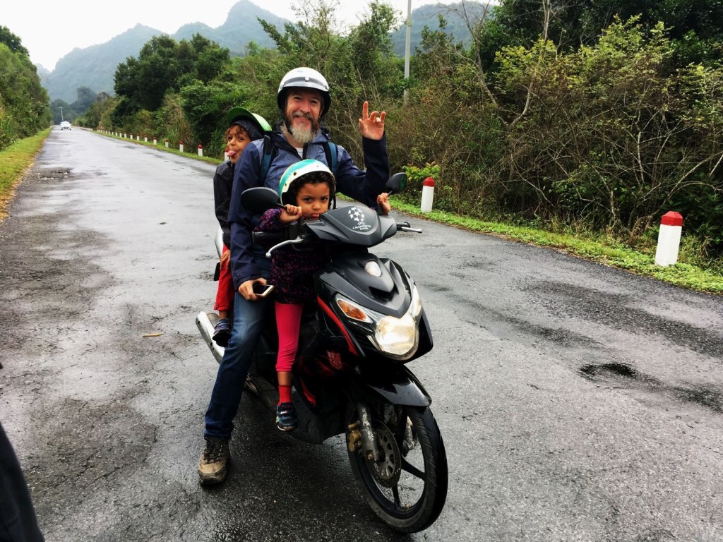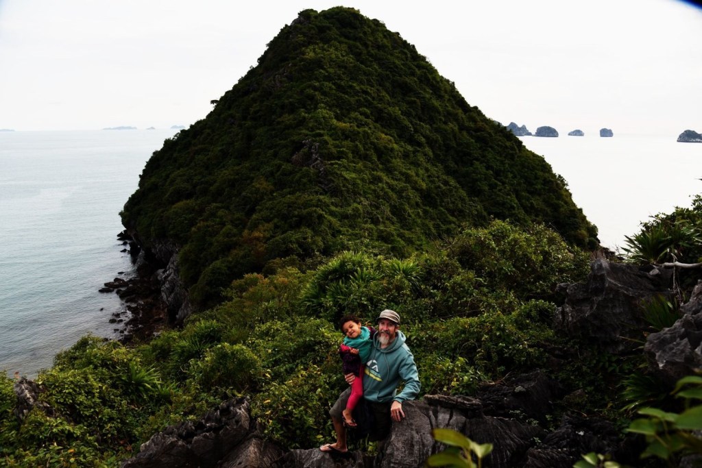 Quelques gouttes de pluie viennent pimenter un peu le tout, alors que nous roulons sur les routes alternant plat et surtout un peu de dénivelé, et c’est sans encombres que nous atteindrons le Parc National de Cat Ba. Une petite ascension plus tard, c’est depuis le sommet de l’un des pics karstiques que nous admirerons celui des dizaines d’autres recouverts de végétation et parsemant la plaine alentour. Sans doute aurions-nous pu apercevoir la mer au loin, mais la grisaille tenace bouche irrémédiablement l’horizon.