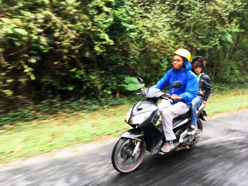 Banco, on trouve notre bonheur, et on déménage à 500 m de notre premier point de chute, avant de nous lancer dans l’exploration de l’île. Tous en…scooter! Aussi faciles à louer que des vélos, et bien plus adaptés pour découvrir cette île qui fait quand même quelque 350 km2. A trois sur l’un, et deux sur l’autre, on avance tranquillement, surtout moi qui enfourche une monture de ce type pour la première fois. Eh bien sûr, pour les enfants, c’est l’éclate totale!
