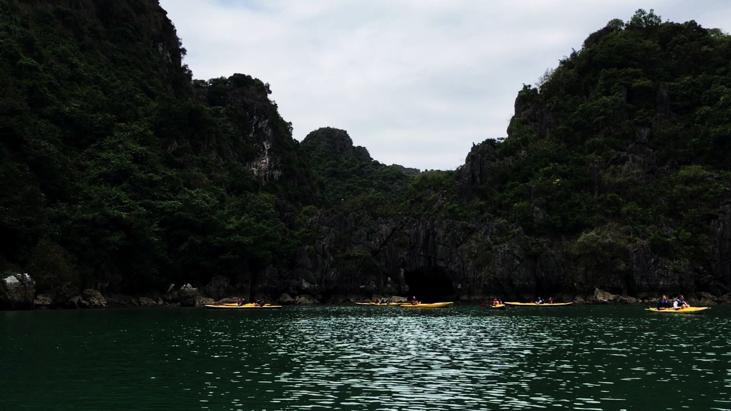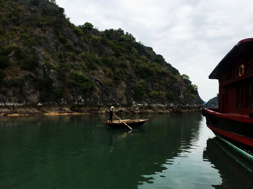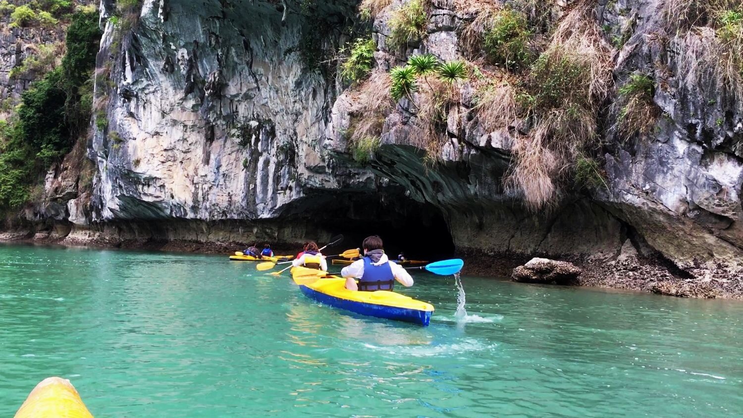 Alors que le ciel se découvre peu à peu, nous faisons une première halte pour une balade en kayak à la découverte de la Bright Cave, de la Dark Cave, puis de criques magnifiques remplies d’une eau où se réflète maintenant un ciel bleu. Moments privilégiés et calmes (sans les enfants, que des touristes restés à bord auront la gentillesse de nous garder). Nous ne sommes finalement qu’une poignée de kayaks à se succéder, en comparaison des flux habituels, et des images que l’on a pu voir d’enfilades des embarcations autour des rochers karstiques.