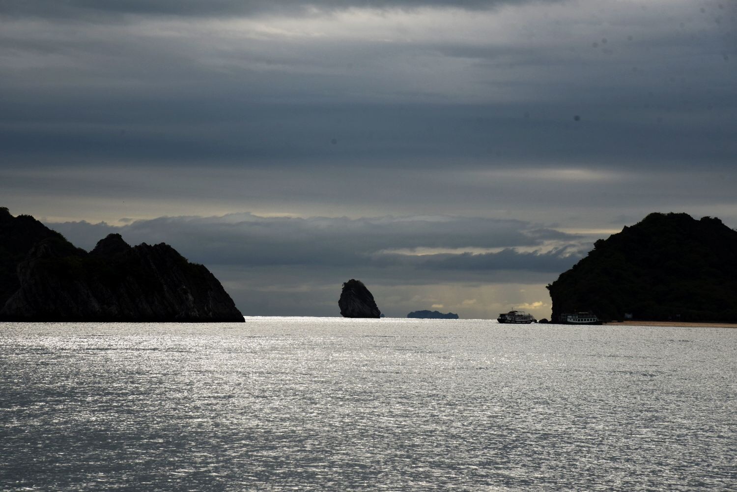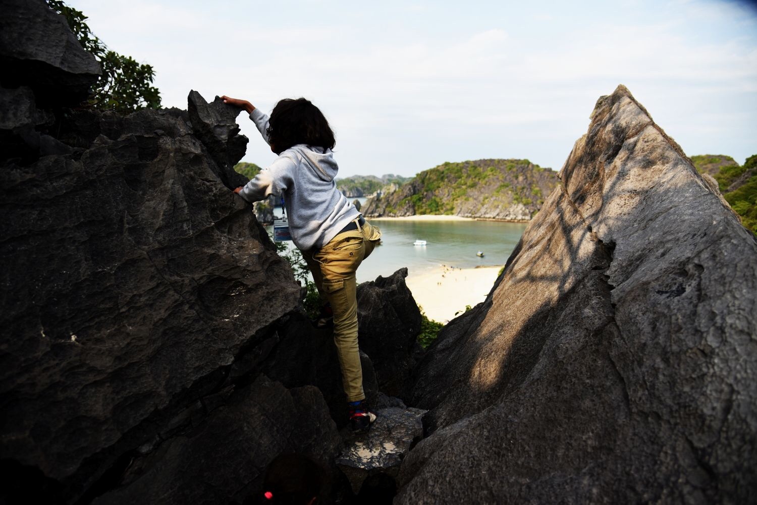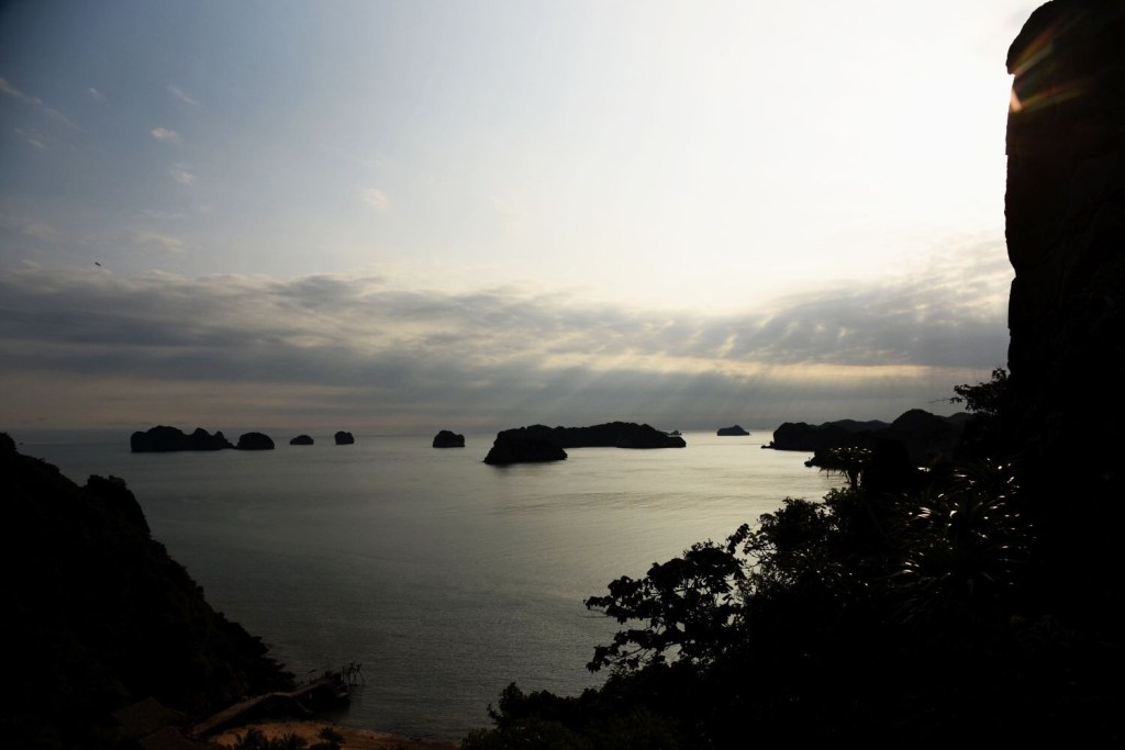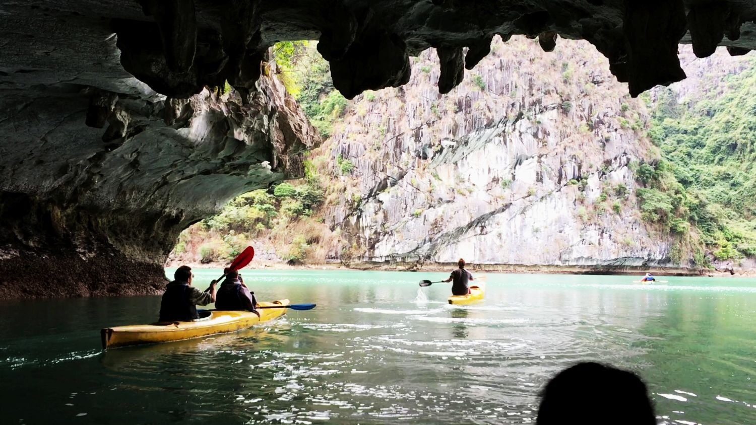 Alors que le ciel se découvre peu à peu, nous faisons une première halte pour une balade en kayak à la découverte de la Bright Cave, de la Dark Cave, puis de criques magnifiques remplies d’une eau où se réflète maintenant un ciel bleu. Moments privilégiés et calmes (sans les enfants, que des touristes restés à bord auront la gentillesse de nous garder). Nous ne sommes finalement qu’une poignée de kayaks à se succéder, en comparaison des flux habituels, et des images que l’on a pu voir d’enfilades des embarcations autour des rochers karstiques.