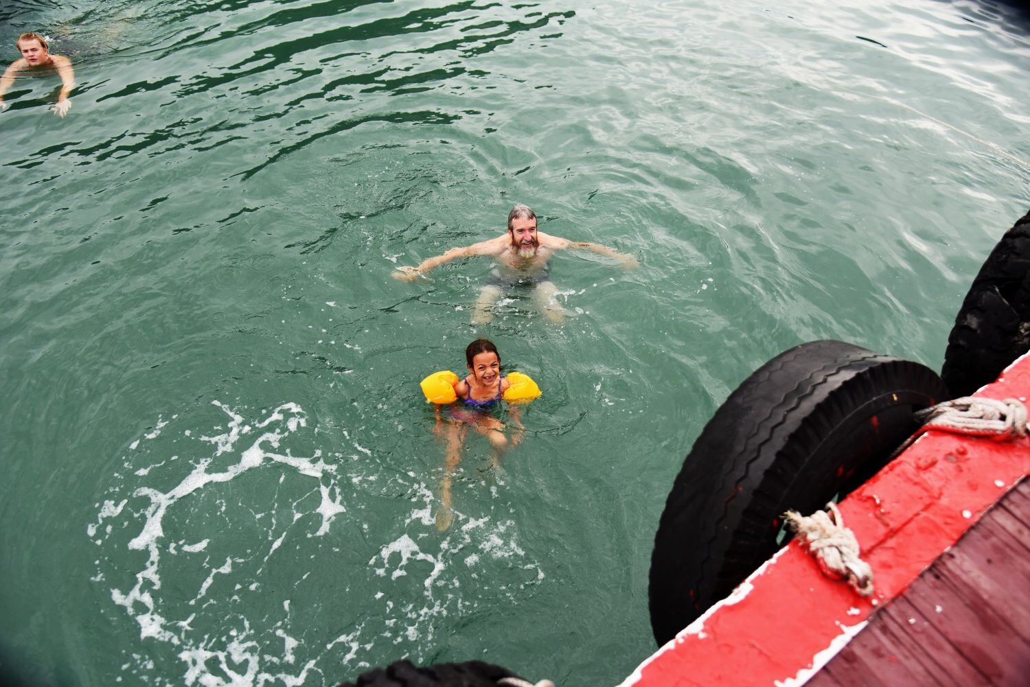 De retour sur le bateau, on se régalera d’un délicieux et copieux (contrairement à ce que l’on aurait pu craindre dans ce type de formule “all included”), avant une pause…baignade! Quelques courageux dont nous (petits et grands) ferons partie se jetteront à l’eau, la plupart du temps depuis les 4 et quelques mètres du pont supérieur du bateau, sans toutefois passer de longues minutes à se prélasser dans l’eau, car la combinaison eau fraîche, soleil timide et petite brise fait qu’on se met vite à frissonner!