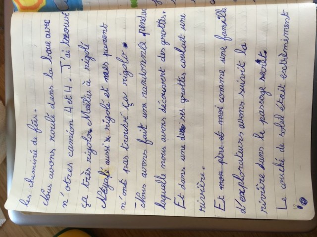 Nous sommes arrivés à une cascade petite mais puissante. Le lendemain matin on s’est baigné (donc ça concerne mon père et moi). J’ai nagé contre le courant. Trois jours après nous nous baladons en bateau dans une grotte où on devait s’arrêter parce qu’il n’y avait pas assez d’eau. On a vu des chauves-souris et on a visité les stalactites et les stalagmites. Le plafond était à plus de dix mètres.