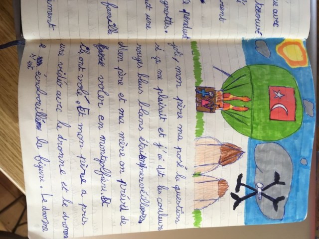 Mon père et ma mère ont prévu de voler en montgolfière, et ils ont volé. Et mon père a pris une vidéo avec le drone et le drone s’est écrabouillé la figure. Le drôle n’est pas tombé jusqu’en bas c’était un gros coup de chance.