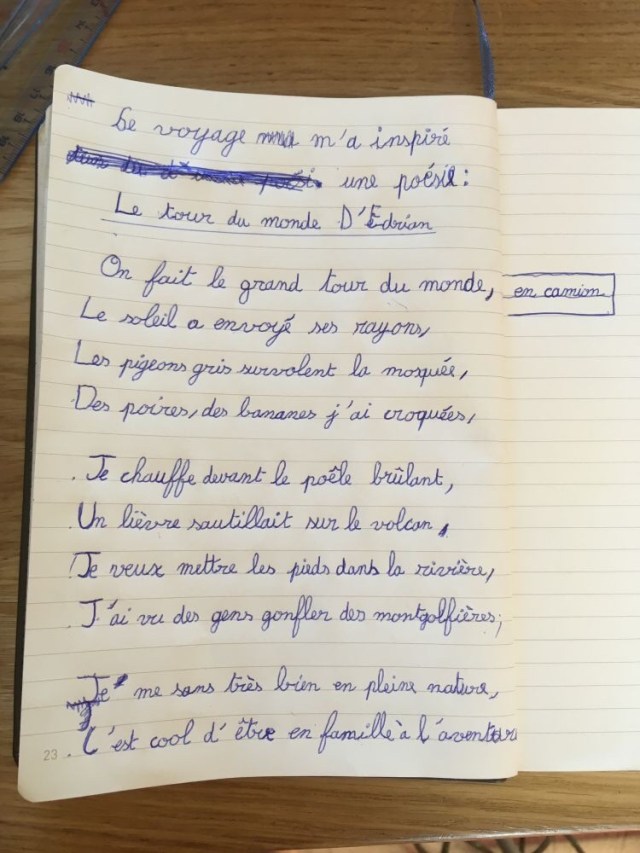 Le lendemain nous sommes partis à Shiraz. On a revu Iraj. Il nous avait fait goûter la glace traditionnelle de Shiraz. Le monument que j’ai préféré est la mosquée rose. Le lendemain on a fait un pique-nique avec les amis d’Iraj. C’était cool. Aujourd’hui nous restons au camion pour faire l’école et le temps calme. Demain maman reviendra. On fera la fête. Maman est arrivée. Nous partons chez Iraj pour prendre le thé, des gâteaux et dans un des gâteaux il y avait de la mousse au chocolat, de la fraise, de l’abricot, de la mousse. Le lendemain nous avons vu les amis espagnol qui étaient à Qheshm. Nous avons fait un barbecue. Il y avait 3 chiens. Le barbecue était délicieux. Le lendemain nous partons voir une cascade. On a marché dans la rivière là où Maëlia a perdu ses chaussettes.